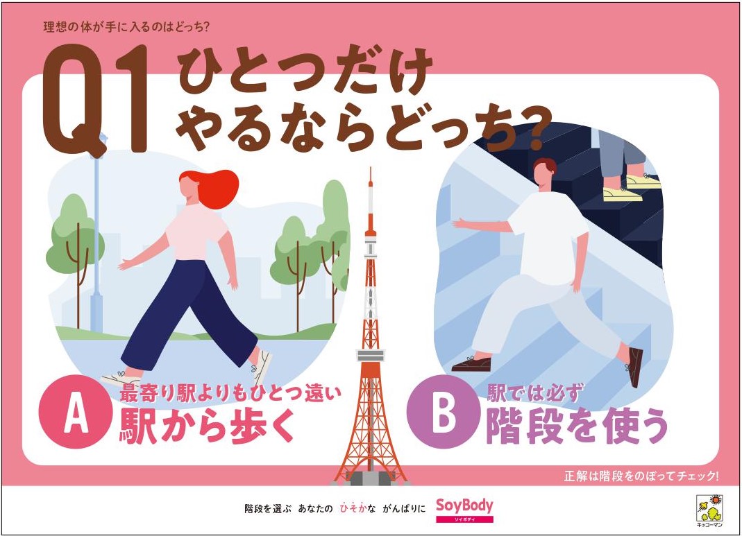 「理想の体が手に入るのはどっち? by SoyBody」は、テレワークや在宅勤務による運動不足が課題となるなか、毎日ひそかに体づくりを頑張る方を応援するためのイベントです。東京タワーのメインデッキを目指して約600段の外階段を登りながら、体づくりについて学べるクイズ型のコンテンツや、ご自身の体の状態を知ることができる「ゆる体力測定チャレンジ」を体験できます。